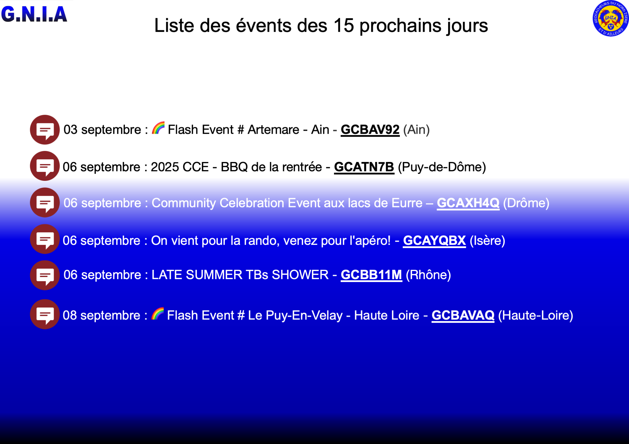 Un peu de visibilité sur les évents prévus entre le 1er septembre et le 15 septembre dans un rayon de 150km autour …