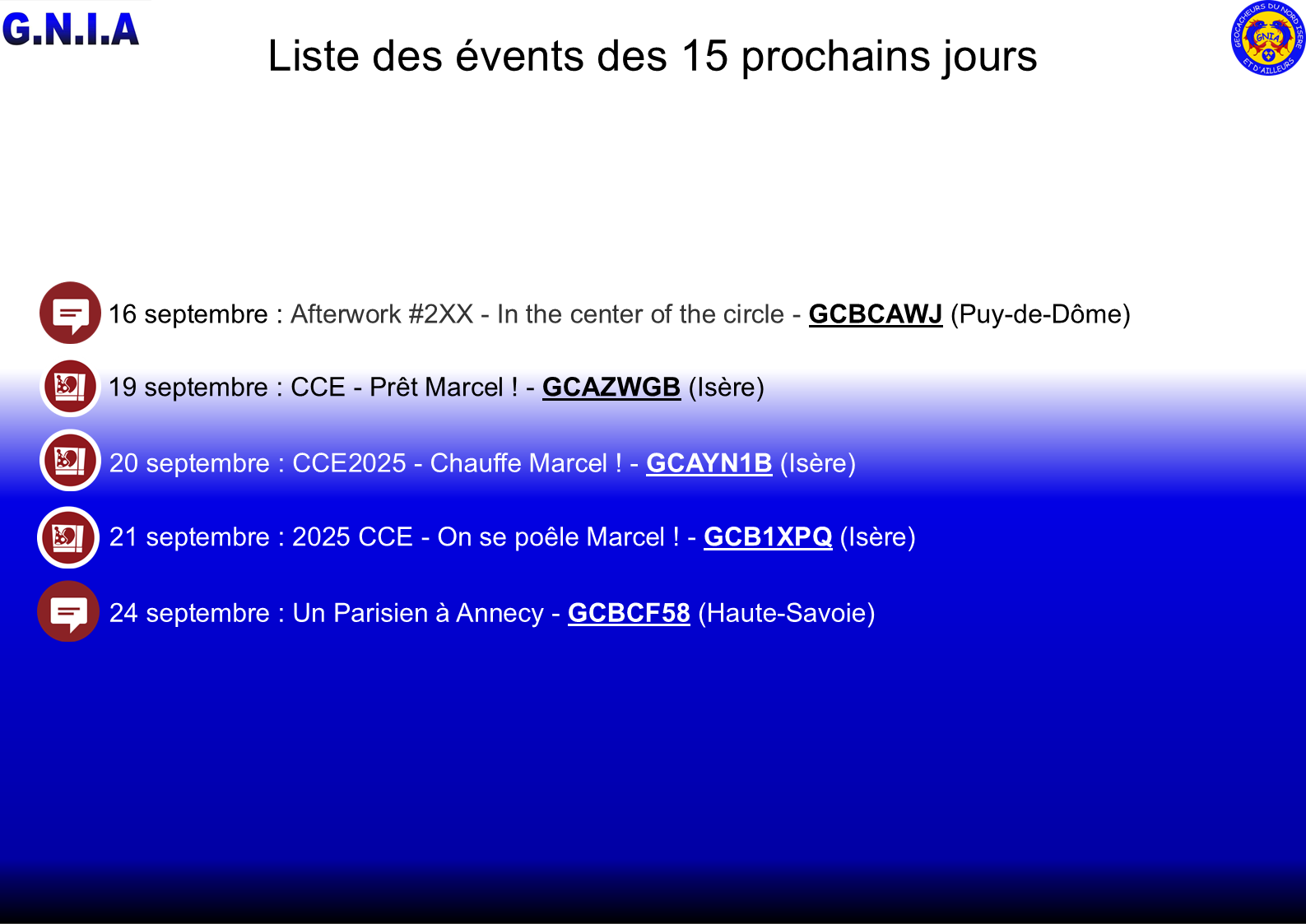 Un peu de visibilité sur les évents prévus entre le 16 septembre et le 31 septembre dans un rayon de 150km autour …